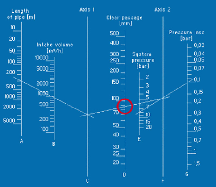 Первая линия A (длина трубы) проводится до линии B (объем впуска) и продолжается до оси 1. Затем линия E (давление в системе) проводится к линии G (целевые уровни потери давления). В завершении полученные пересечения с осями 1 и 2 соединяются прямой. Эта прямая линия пересекает линию D; теперь можно считать значение требуемого внутреннего диаметра.