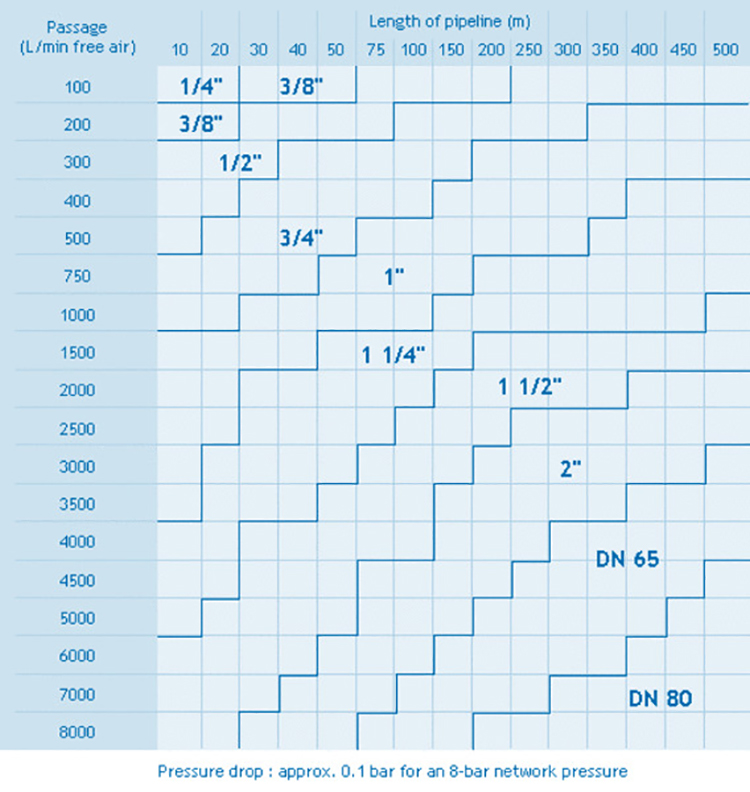 Как правило, номинальный размер линии сжатого воздуха должен быть достаточно большим. Самые большие потери давления возникают из-за слишком больших или слишком малых сечений трубопроводов сжатого воздуха. Опыт показывает, что изначально правильно спроектированная сеть сжатого воздуха впоследствии позволяет подключать к существующей сети трубопроводов все большее количество потребителей и выполнять перенастройку сети для удовлетворения новых требований. Нет ничего необычного в том, что для увеличения потребления необходимо повысить только выход из компрессора.