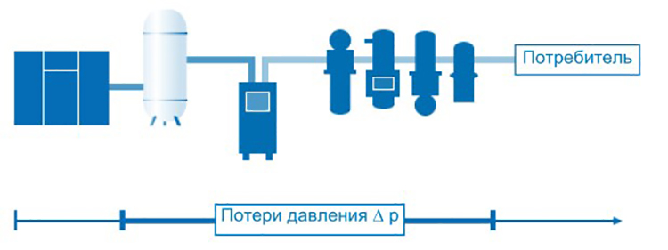 При условии оптимально спроектированной линии подачи сжатого воздуха, падение давления между генерацией и потребителем можно подразделить следующим образом: