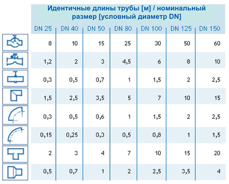 Рисунок 4: Влияние элементов трубопровода на характеристики давления. Сопротивления отдельных элементов трубопровода представлены из расчета на один метр длины прямолинейного участка трубы (эквивалентная длина).